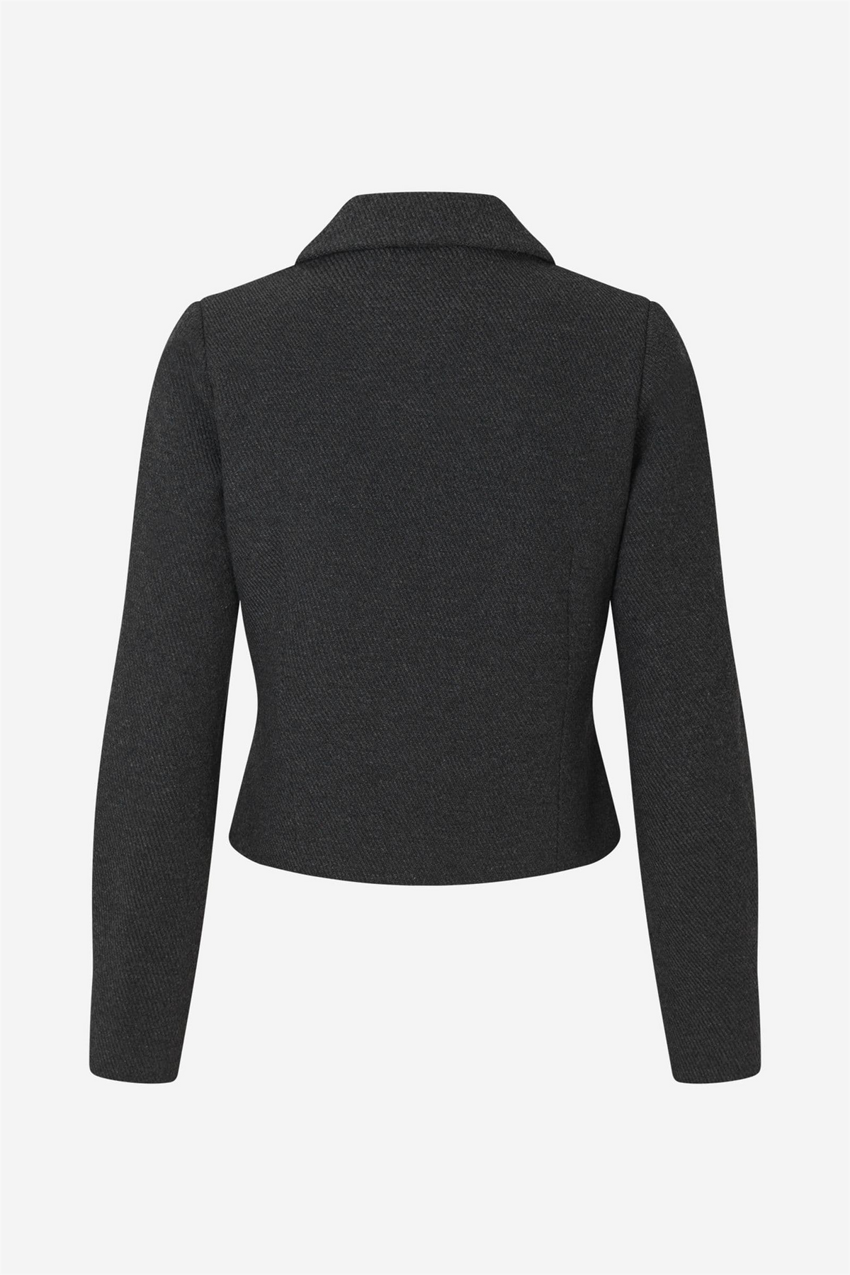 Kul blazerjakke fra danske ENVII. Teksturert ullblanding med tonalt fiskebeinsmønster. Krage og glidelåslukking foran. Polstrede skuldre og formede ermer med invertert plissering ved mansjett. Formsydde sømmer foran og bak. Kort og lett innsvinget silhuett.