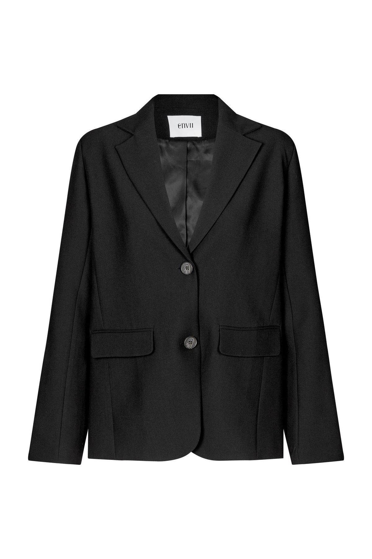 Stilren og klassisk blazer fra danske Envii. Lett og glatt stoff. Hakk jakkeslag. Lett polstring på skuldrene. To-knapper foran. To klafflommer. Helforet. Litt løs passform.Bruk den sammen med buksen for et komplett look