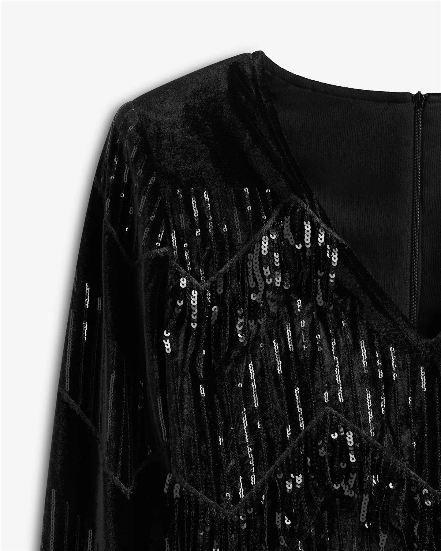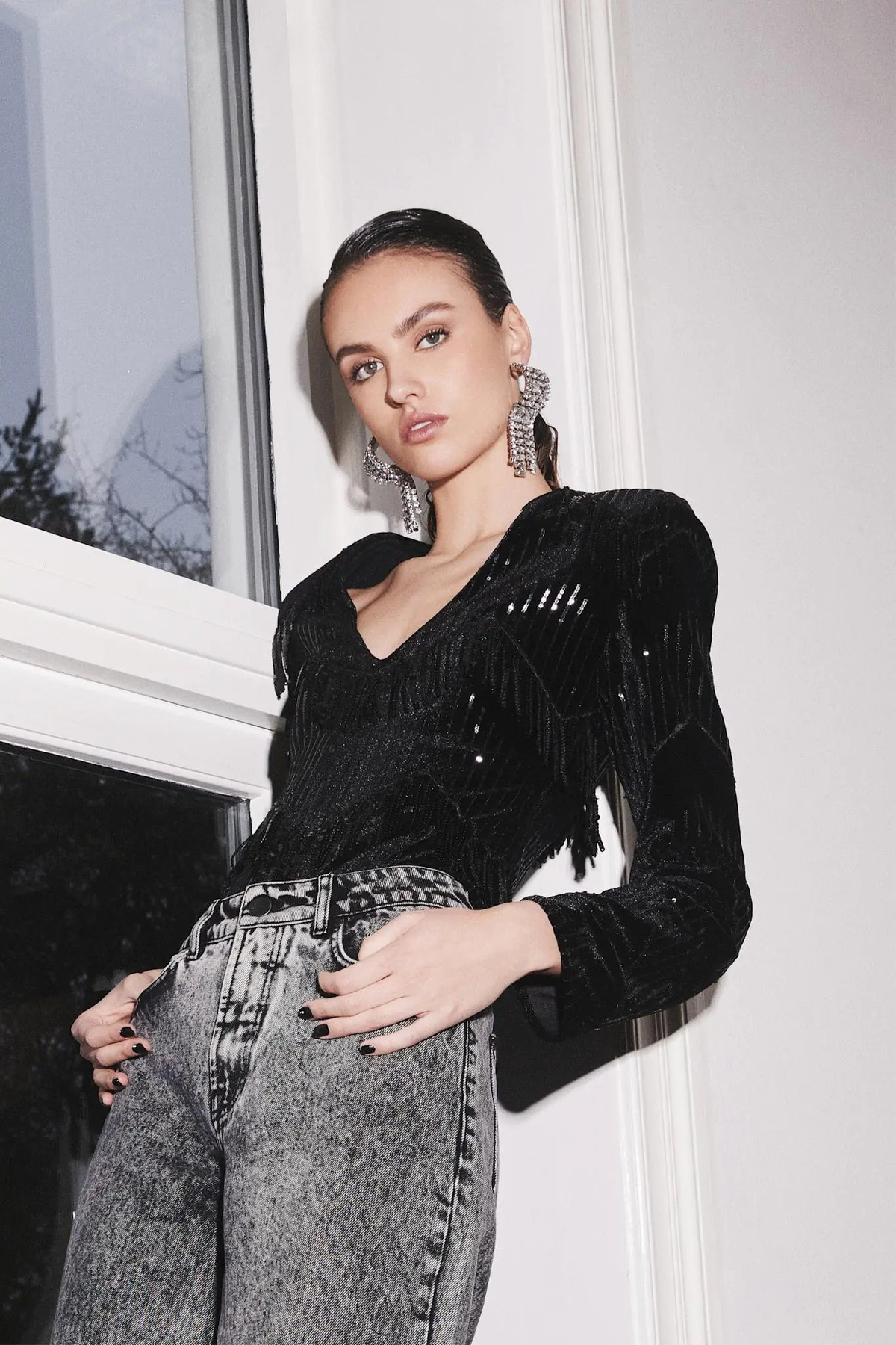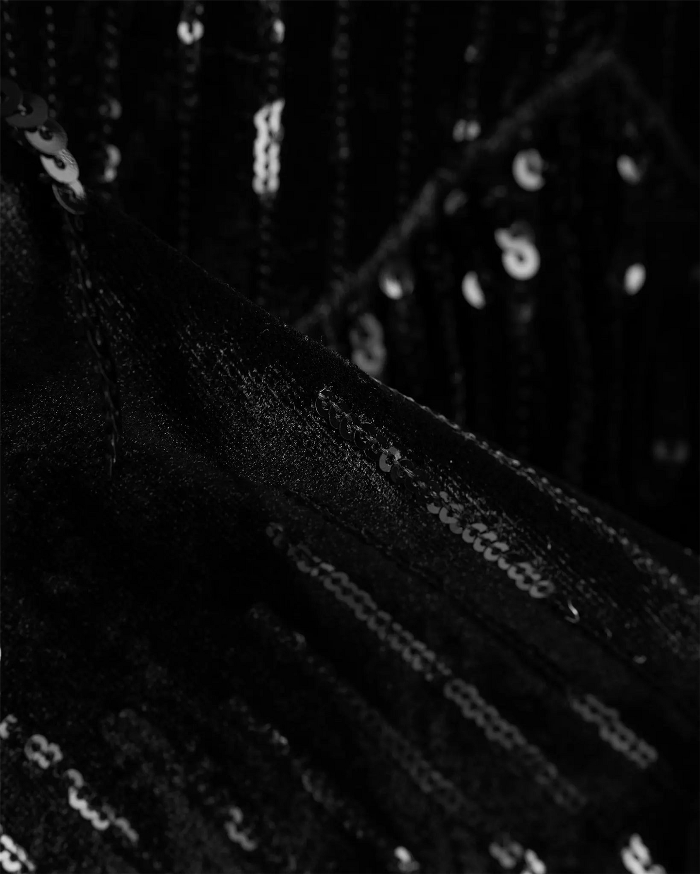 Lekker festtopp fra norske Iben! Moonlight-toppen er sesongens statement-plagg. Den er laget av en elastisk fløyelsjersey og prydet med glitrende paljettkanter som beveger seg vakkert med hvert steg. Den dype utringningen og de skarpe skulderputene skaper en dristig og selvsikker silhuett, mens den skjulte glidelåsen bak og den høye splitten bak tilfører både eleganse og edge. Modellen er 180 cm høy og har på seg størrelse XS.