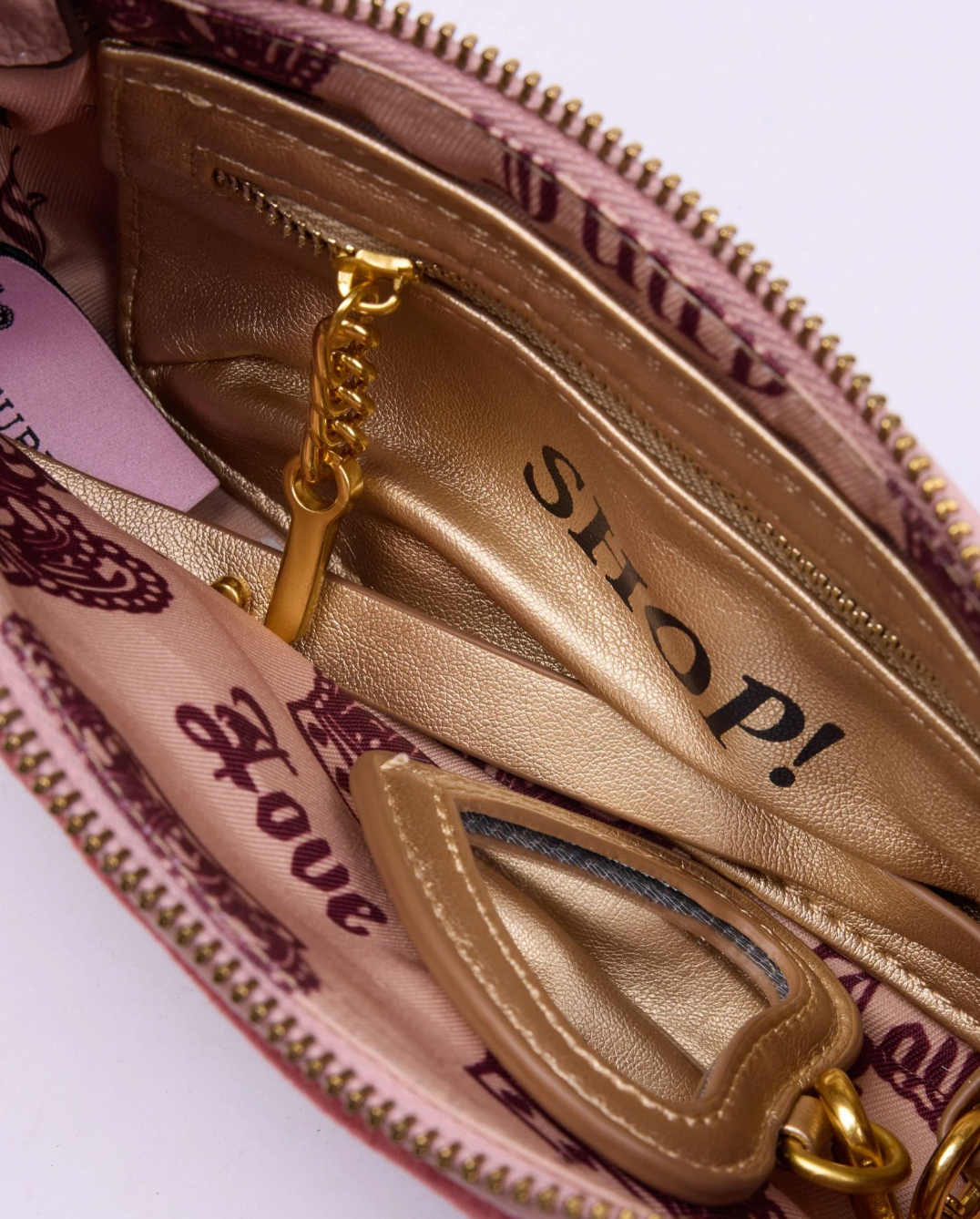 Liten skulderveske i Dark Red velour fra Juicy Couture. Denne vesken har et håndtak og detaljer i PU og er ferdig med gammelgullbeslag. Vesken lukkes med glidelås og har også en søt hjertelås og nøkkelanheng.