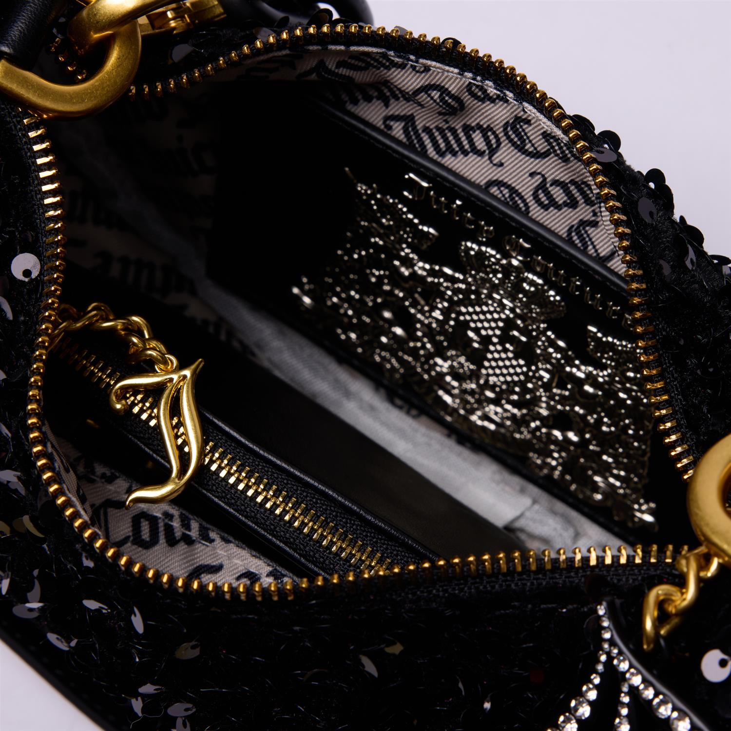 Innvendig finner du signaturfôret med Juicy Couture-logo og praktiske lommer til små nødvendigheter, perfekt for både fest og hverdagsbruk når du vil skille deg ut.
