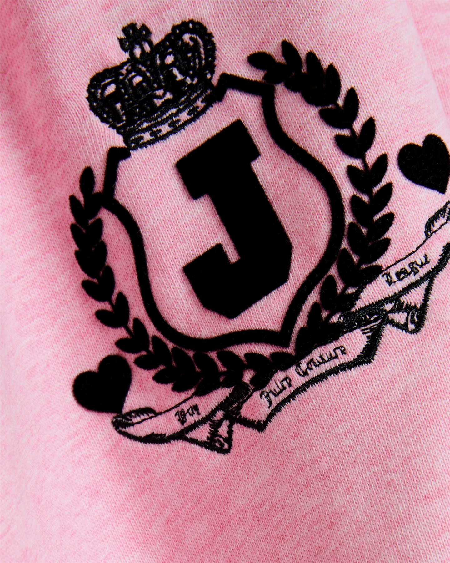 Myk joggebukse fra amerikanske Juicy Couture. Middels høye joggebukser med mansjetter i rosa melert fleece. Disse avslappede joggebuksene har en flock- og brodert Heritage-crest på venstre hofte og to sidelommer. Disse treningsbuksene har en ribbestrikket linning og er fullført med en brodert krone og flock J-logo bak.