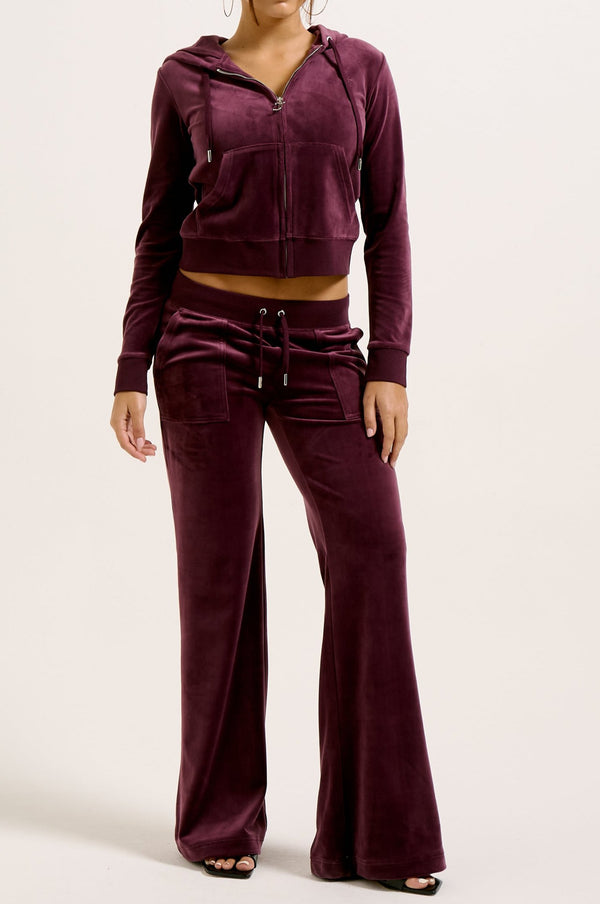Oppgrader loungewear-garderoben din med denne lekre joggebuksen fra amerikanske Juicy Couture. Disse myke velurbuksene har lav midje og utsving i bena for et stilig og behagelig utseende. Med en tettsittende passform, justerbar midjebånd og baklommer er denne komplett.men du kan style den med Juicy Couture Robertson Hoodie for et matchende sett!