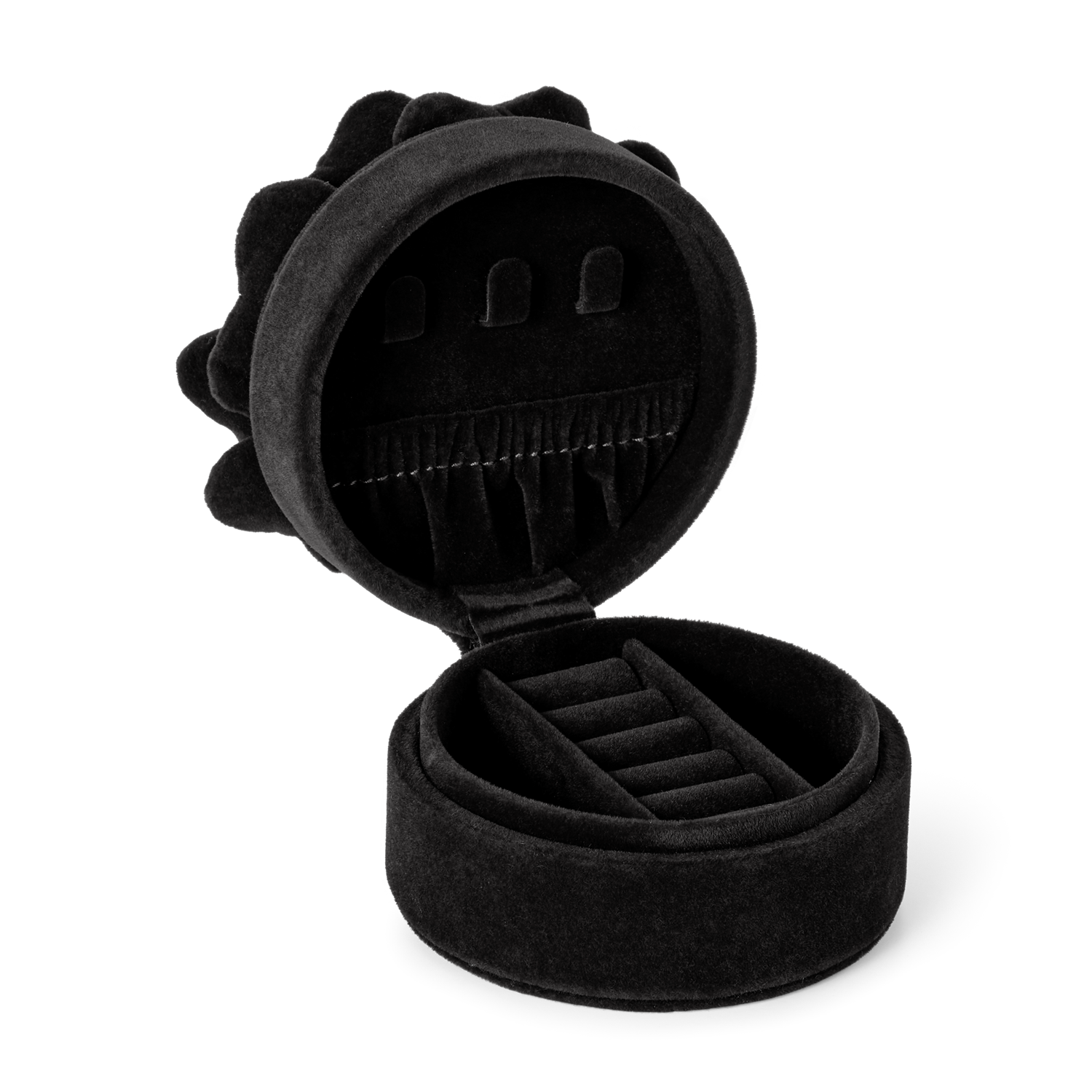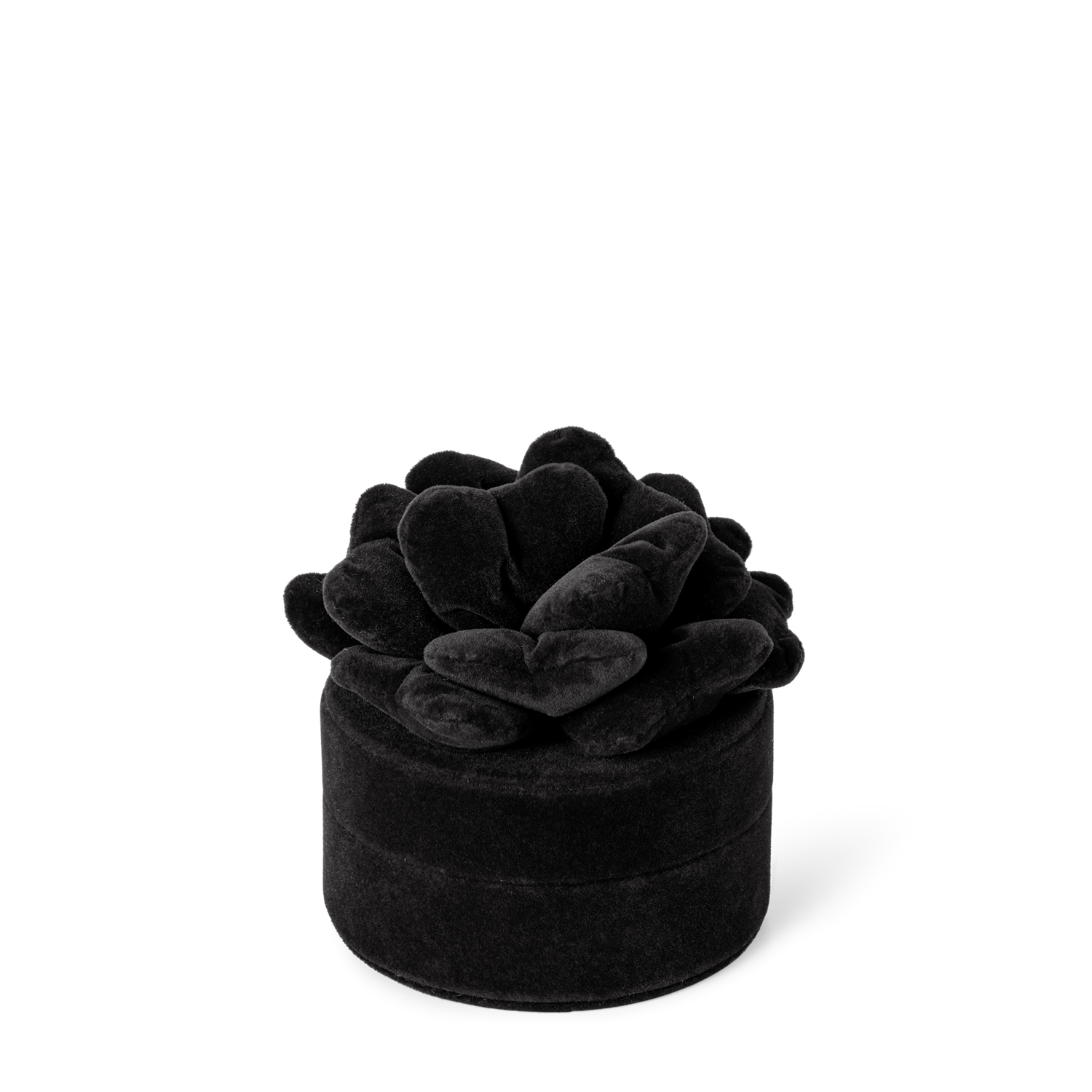 Velourete smykkeskrin fra danske DA ET. Et rundt smykkeskrin med en dekorativ blomst på lokket, dekket i myk velur både inn- og utvendig. Innvendig er det plass til ringer, halskjeder og små øredobber, organisert i separate rom med ringdeler og kroker i lokket. En magnetisk lukking holder alt samlet på en enkel og elegant måte.