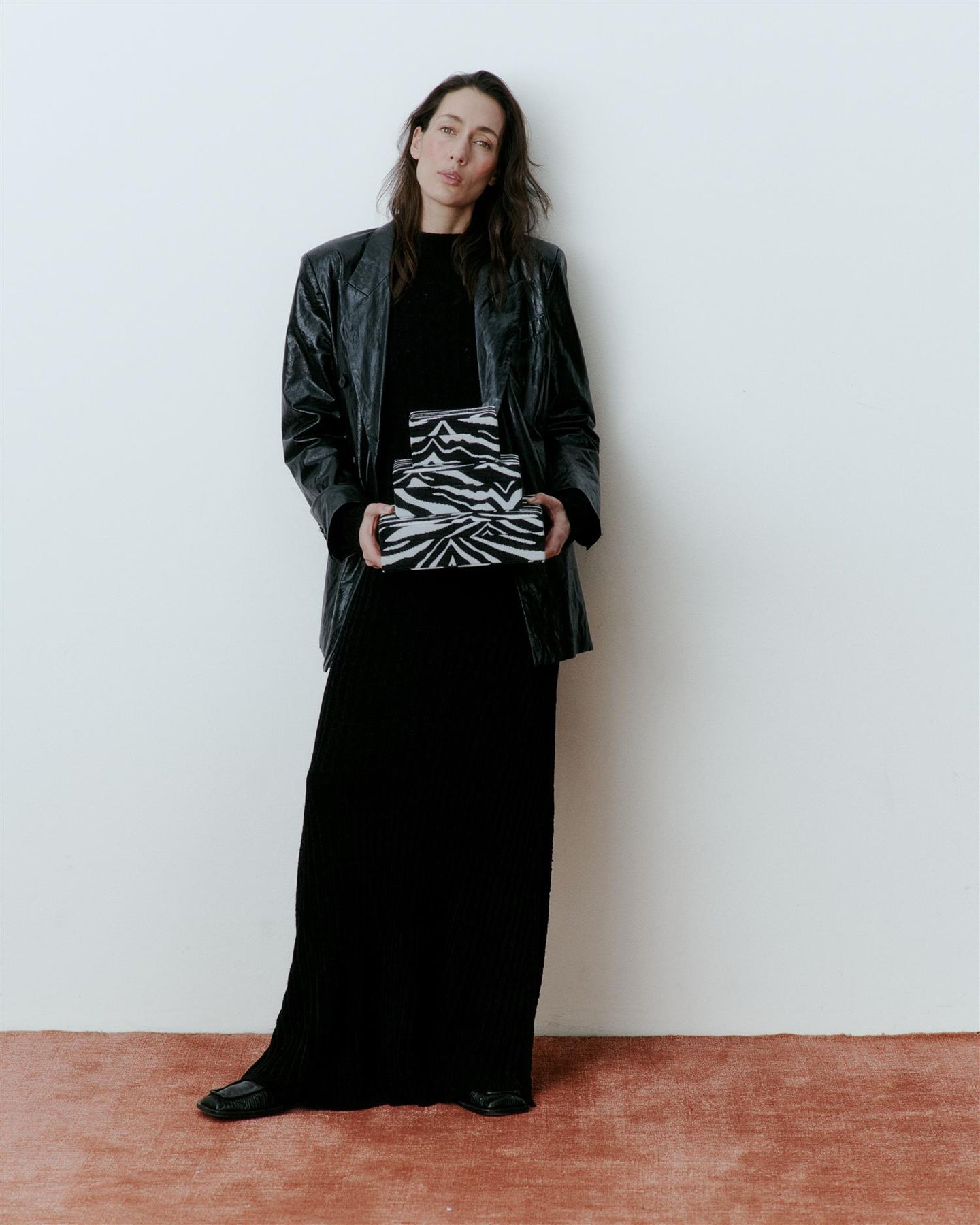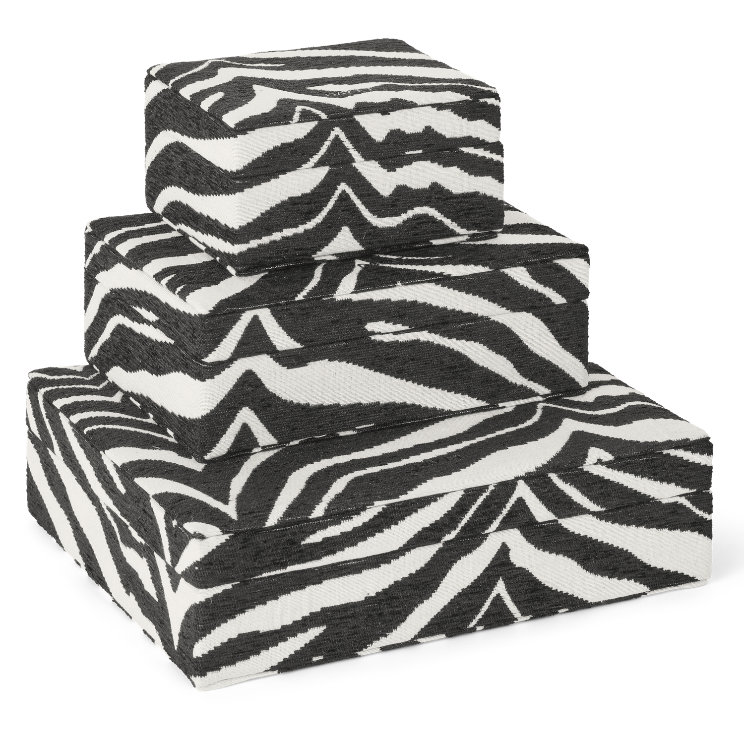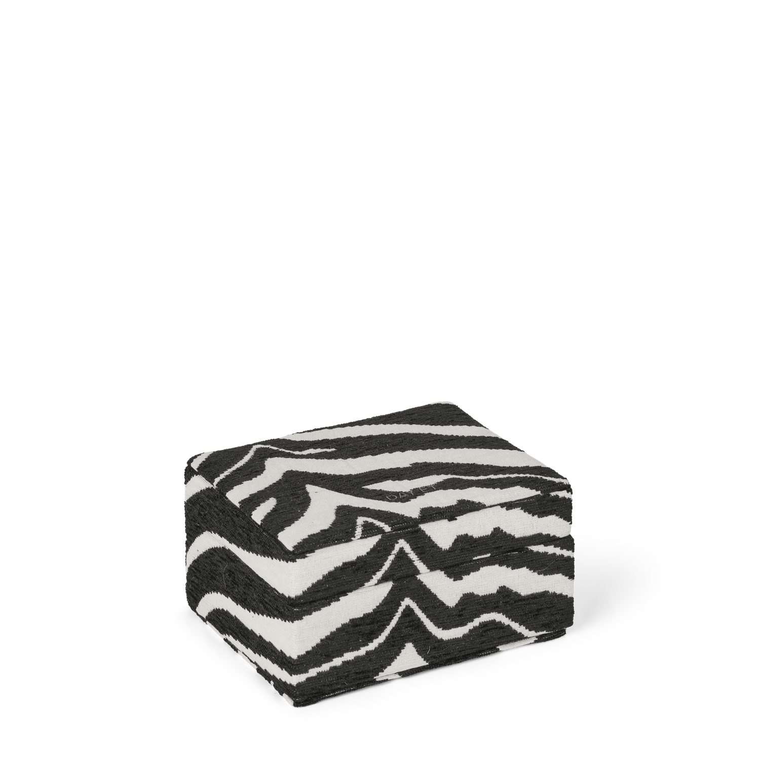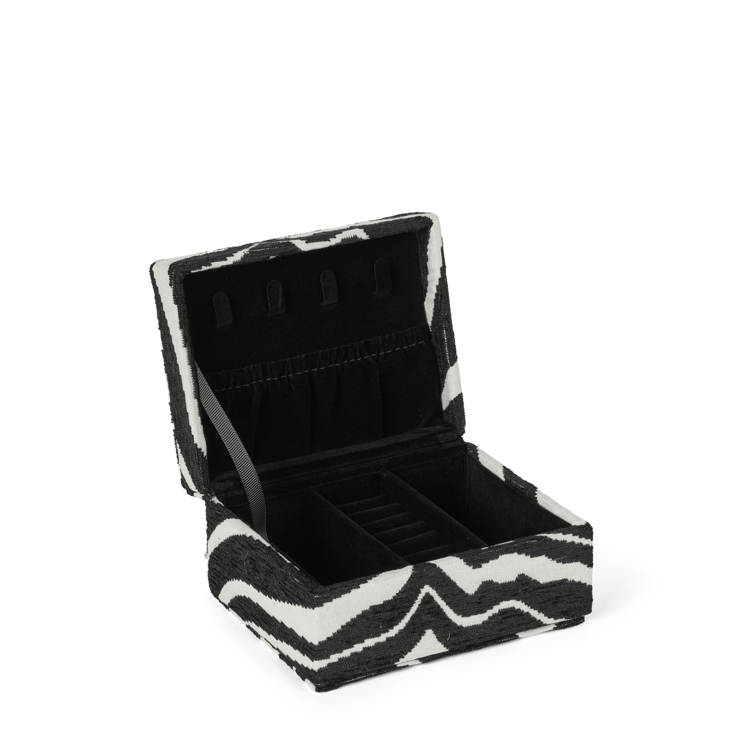 Smykkeskrin fra danske DAY ET. Dette lille smykkeskrinet har et særegent jacquardvevd sebramønster og flere rom for oppbevaring. Magnetlukkingen og det svarte velurfôret med praktiske skillevegger og halskjedekroker gjør det både funksjonelt og stilig.