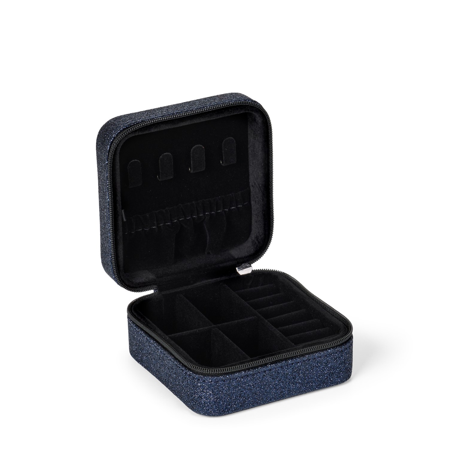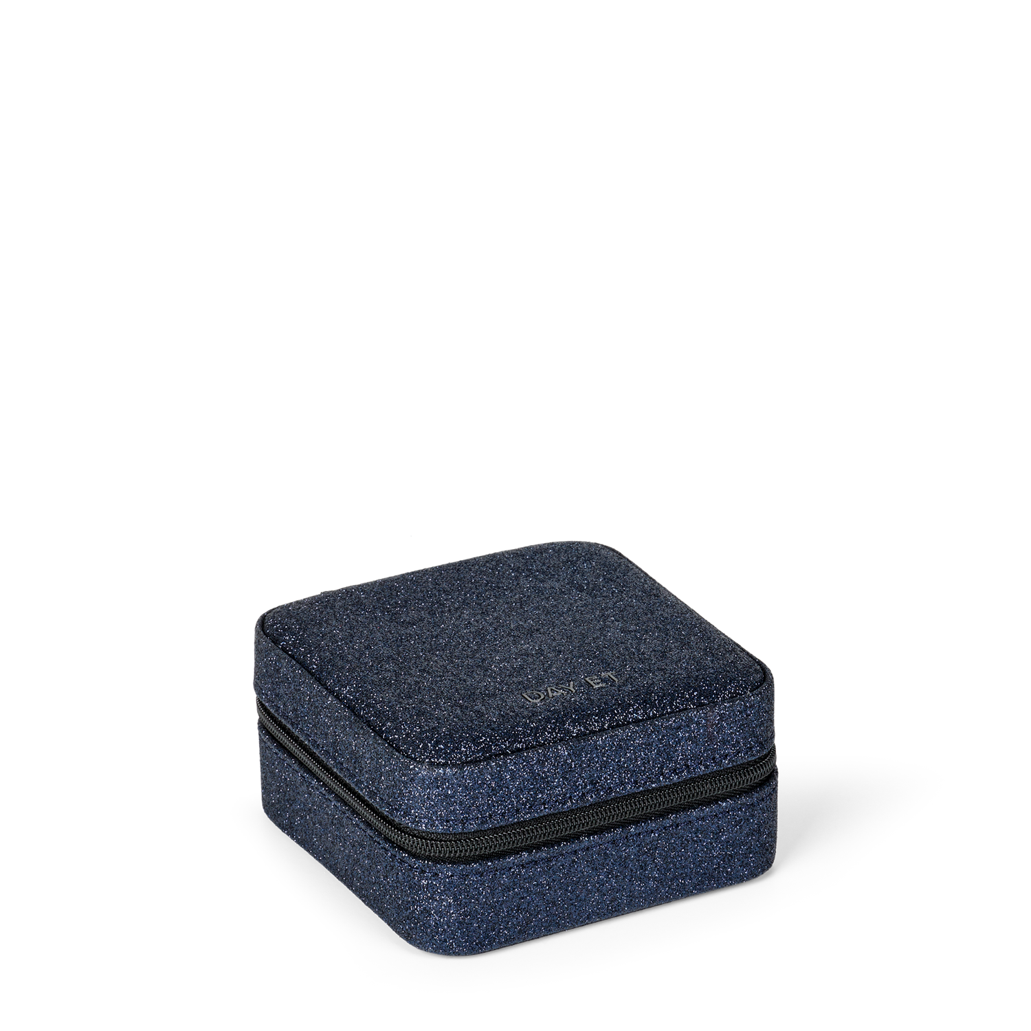 Smykkeskrin fra danske DAY ET. Dette firkantede smykkeskrinet kombinerer funksjon og form i et kompakt design. Innvendig finnes flere rom og kroker i lokket for halskjeder, alt kledd i svart velour. Det glitrende ytre og den svarte glidelåsen skaper en fin kontrast og gjør det til et selvfølgelig valg både hjemme og på reisen.