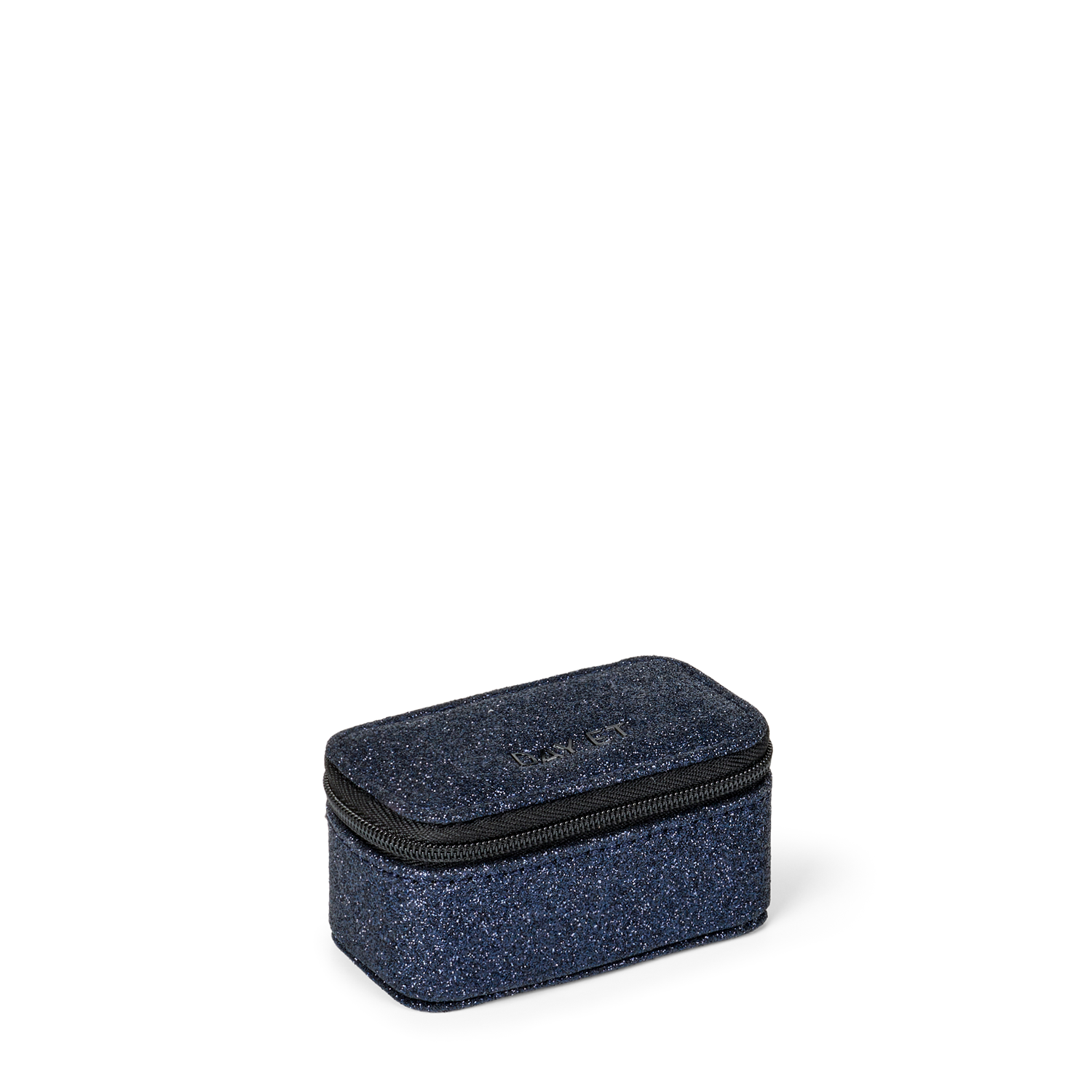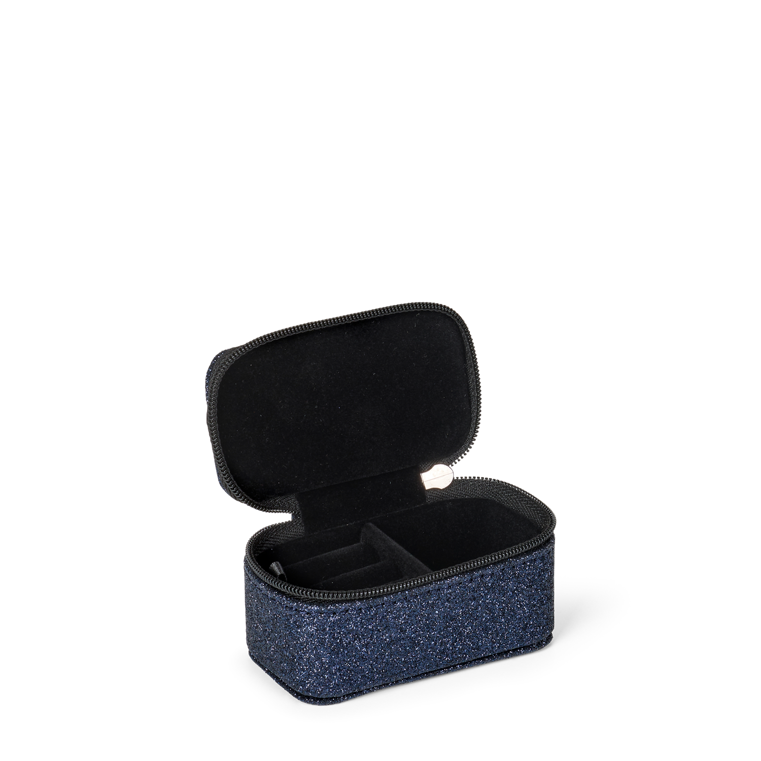 Smykkeskrin fra danske DAY ET. Et lite smykkeskrin med plass til det viktigste, perfekt når du vil ta med deg smykkene dine på reise. Det har to separate rom og svart velour innvendig som beskytter smykkene. Den mørkeblå glimmereffekten og glidelåsen gir et diskret, men iøynefallende uttrykk.