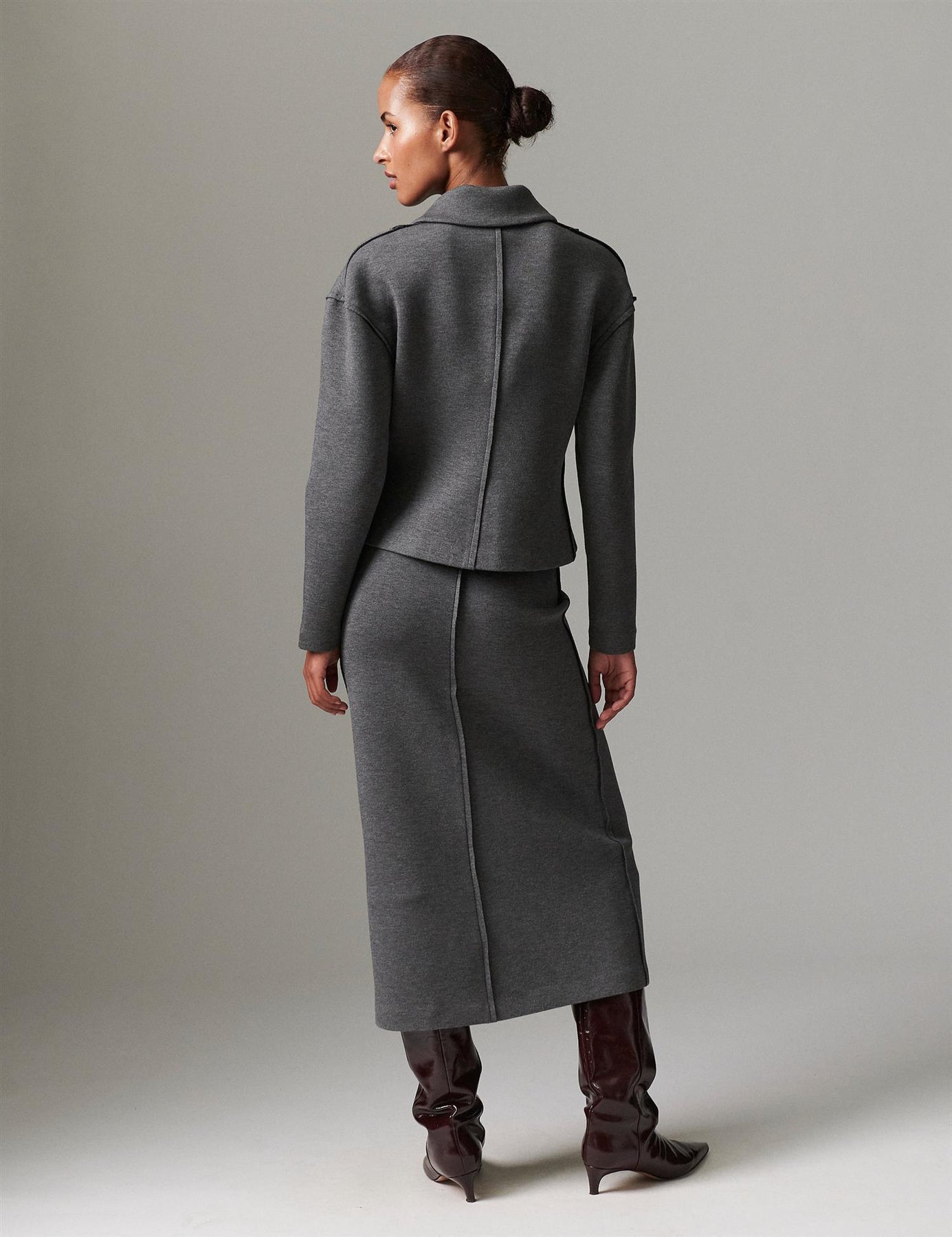 Stilig skjørt fra danske Day Birger et Mikkelsen. Dette mellomlange skjørtet har en elastisk scuba-tekstur og en lett A-linje silhuett. Det har elastisk linning og hevede sømmer på midten foran. Skjørtet har en smal passform.