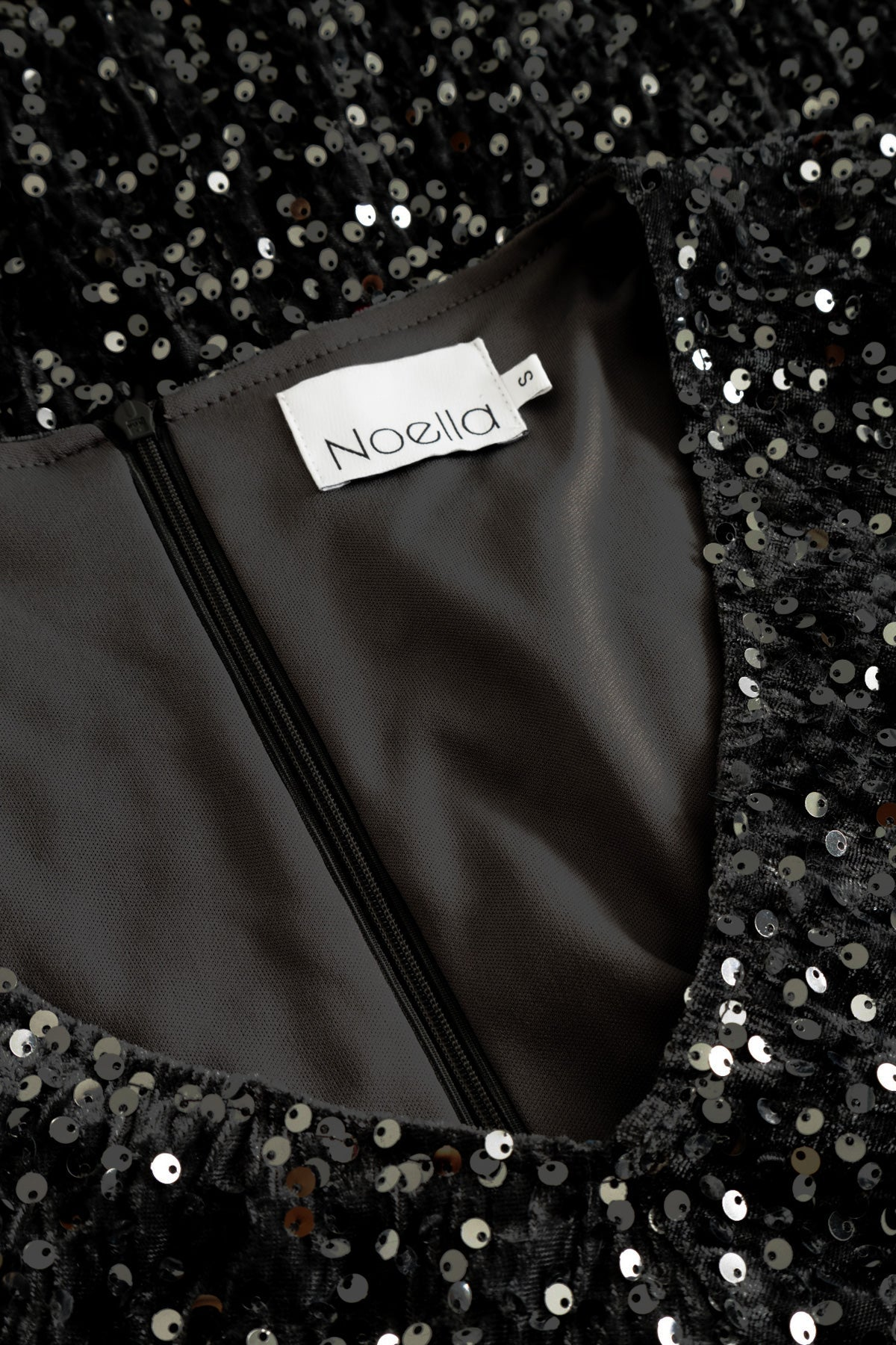 Nydelig paljettkjole fra danske Noella. Den har en dyp v-utringning, lange ermer og rynkede detaljer foran som gir en flatterende passform. Slim Fit passform.
