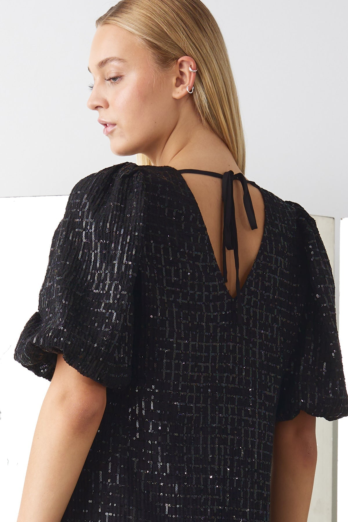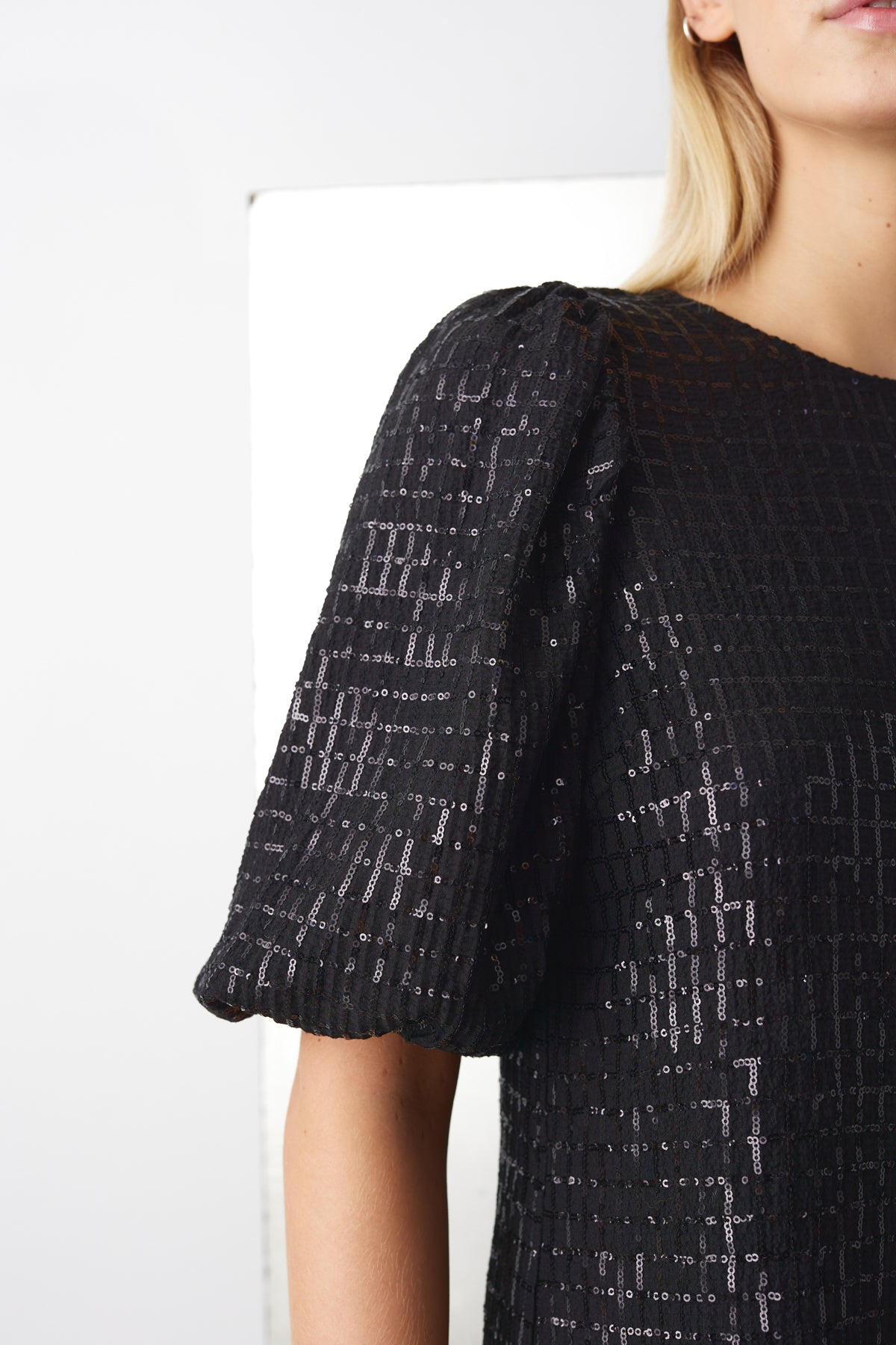 Nydelig kjole fra danske Noella. En elegant midi-kjole med korte puffermer og en avslappet, rett silhuett. Laget av et vakkert teksturert stoff med en subtil glans, som blander sofistikasjon med letthet. Perfekt for både festlige anledninger og stilfull hverdagsbruk.