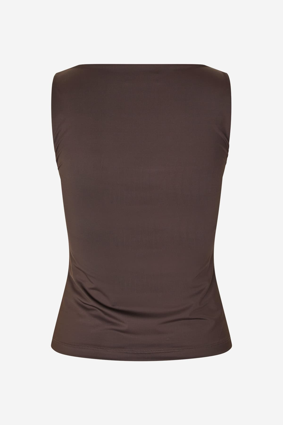 Stretchy ermeløs topp fra danske Envii. Supermykt og elastisk stoff. Litt bredere rund hals. Dobbeltsøm rundt nederste kant. Delvis foret. Tett passform.