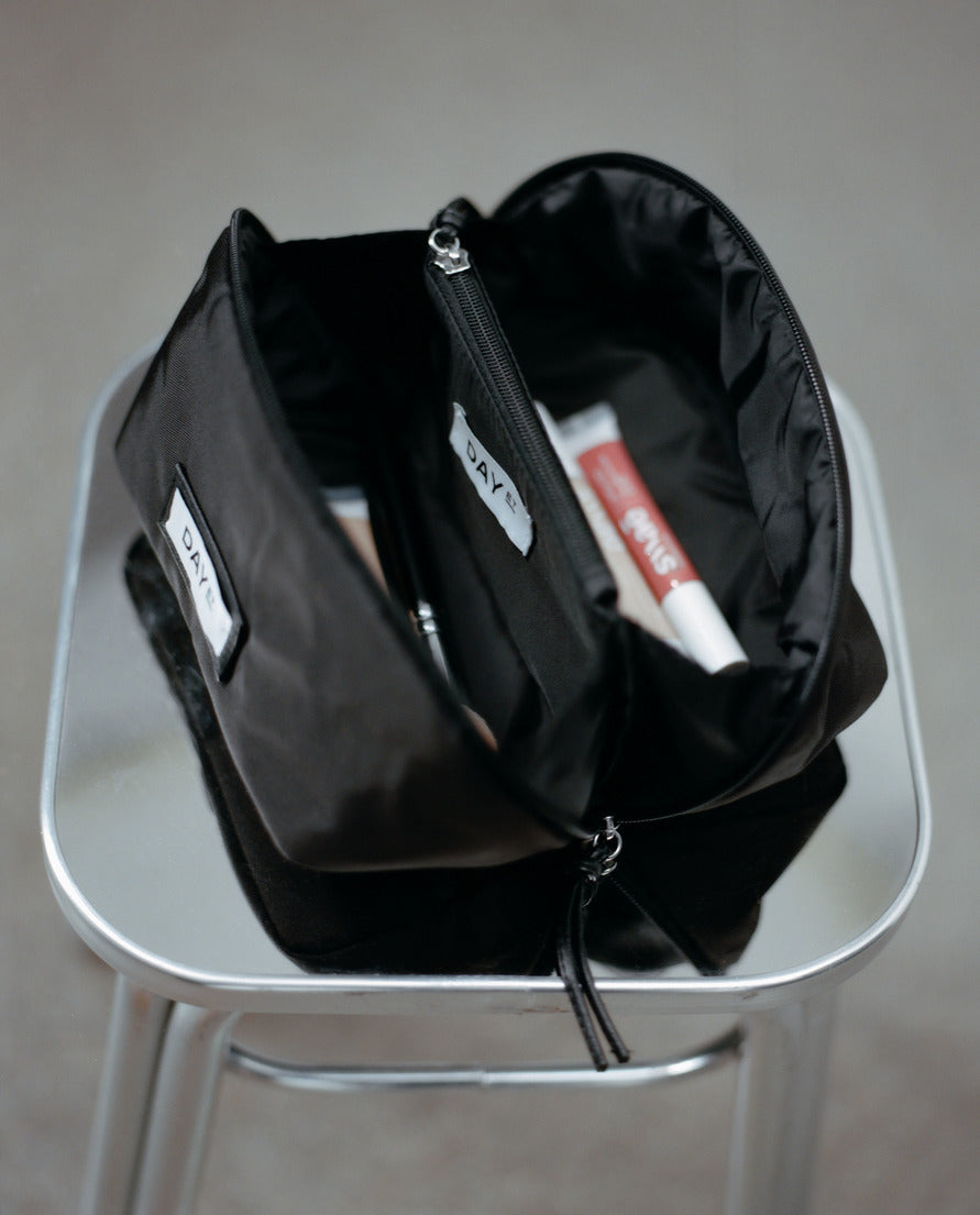 Superpraktisk toalettmappe fra danske DAY ET. Denne praktiske toalettvesken kan brukes både hjemme og på farten, og den har plass til all favorittsminken din. Det ytre stoffet og det indre fôret er laget av 100% sertifisert resirkulert materiale. Den åpnes med glidelås og innvendig har den to åpne rom og en glidelåslomme slik at du enkelt kan organisere sminken.