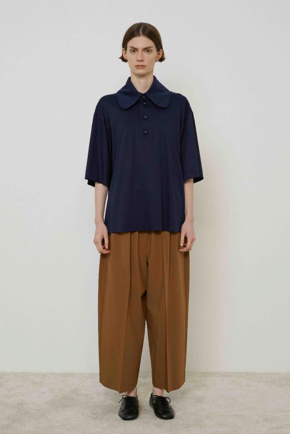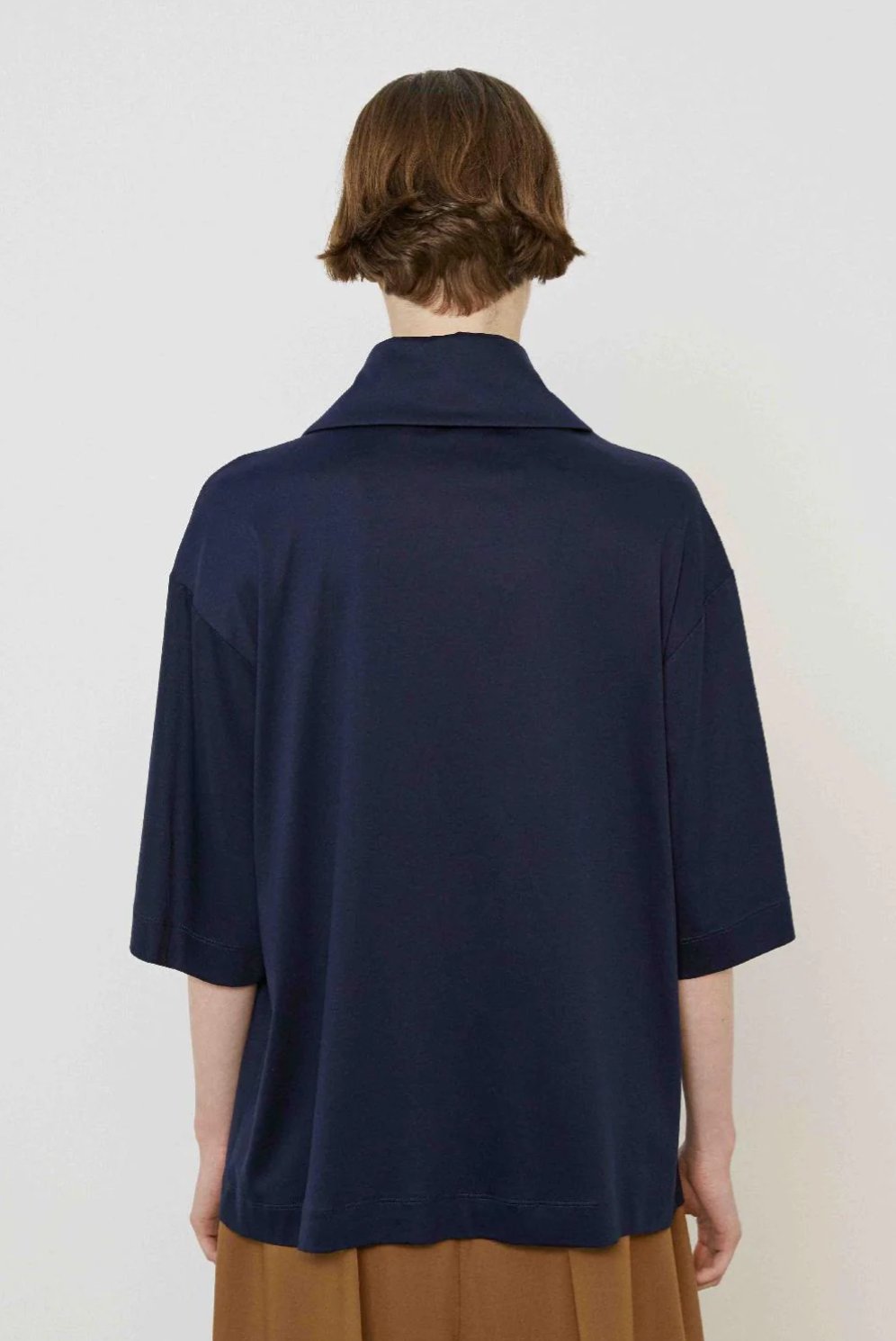 Denne kortermede toppen kombinerer komfort og særpreg med sitt myke stoff og en markant, vattert krage som gir plagget en unik og sofistikert karakter. Modellen har fire knapper i front og en avslappet passform som gjør den både behagelig og lett å style.