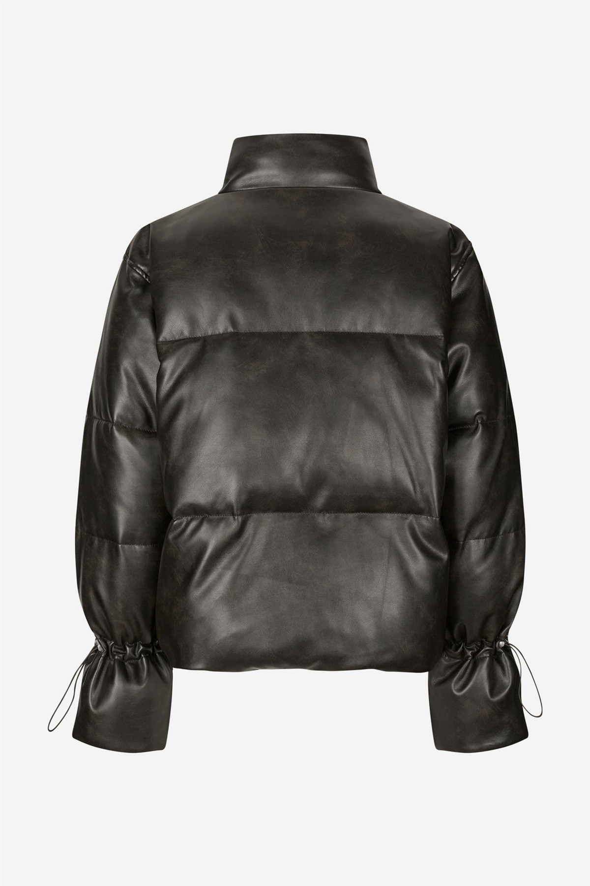 Lekker jakke fra danske Envii. Fôret pufferjakke i imitert skinn. Glatt stoff med skinnutseende og vattert innside. Glidelåslukking foran. Lange ermer og to sidelommer. Elastisk snøring med stoppere i mansjetter og nederkant. Heldekkende fôr. Normal passform.