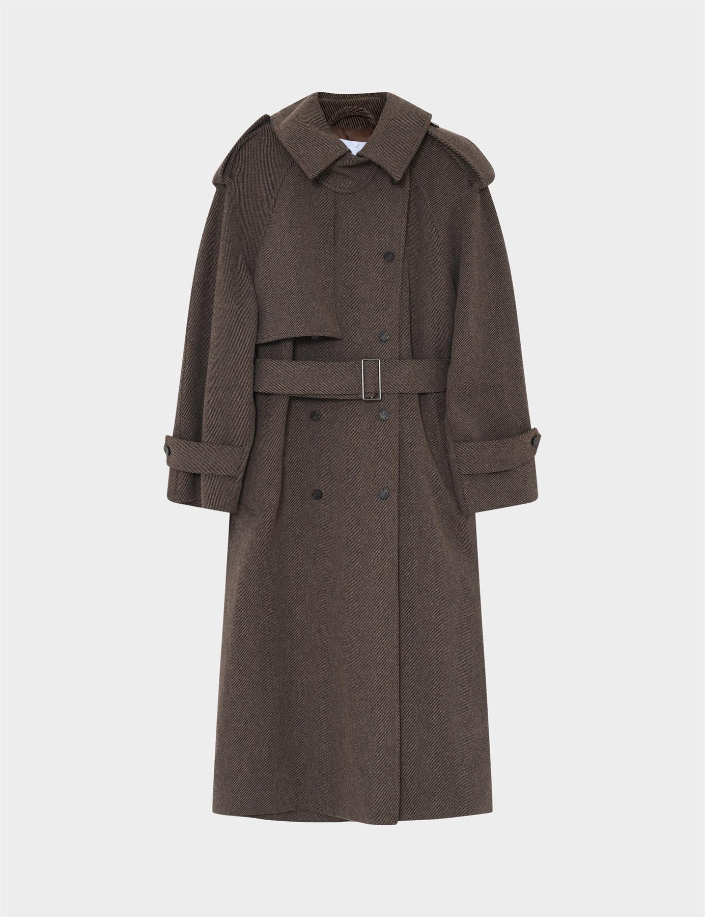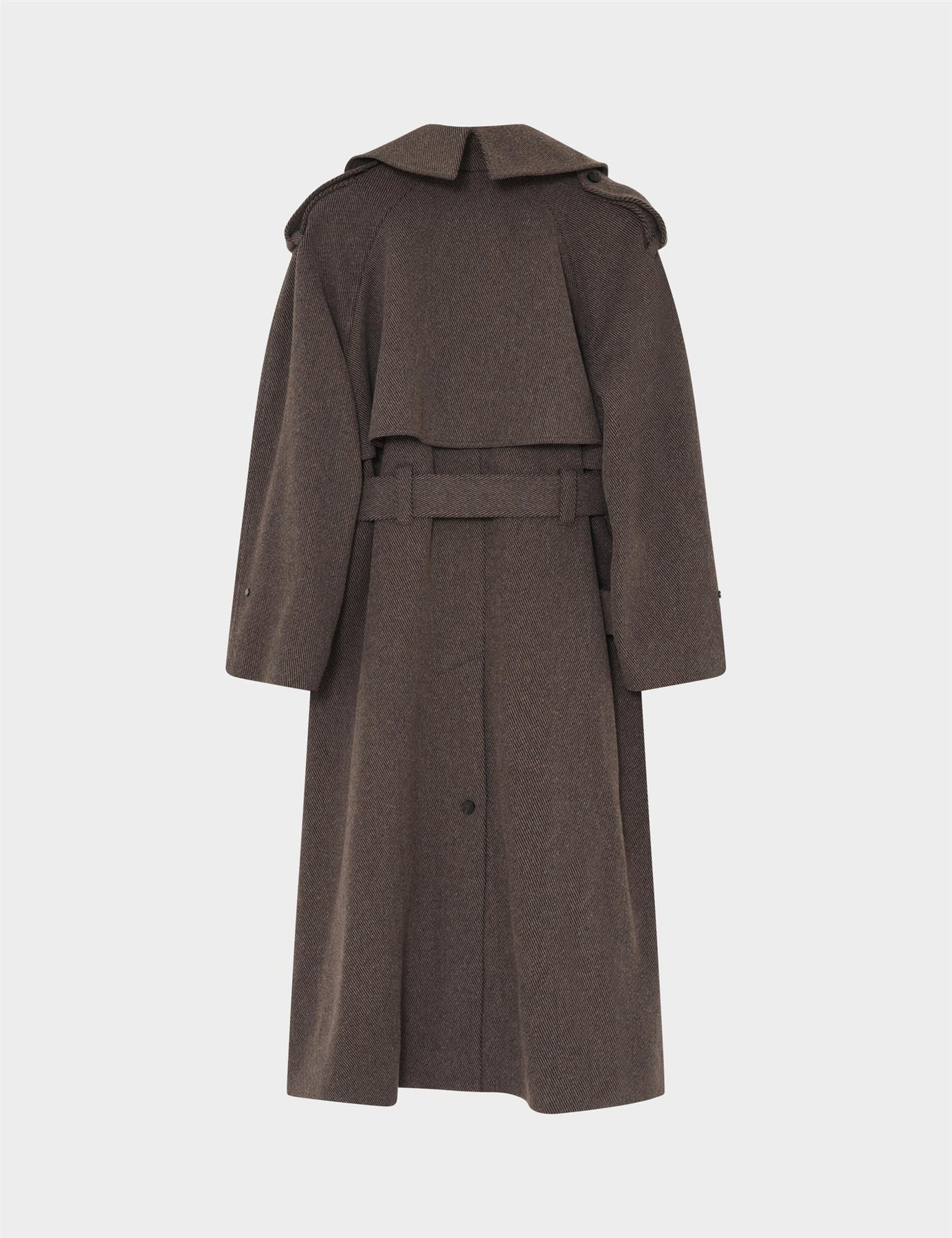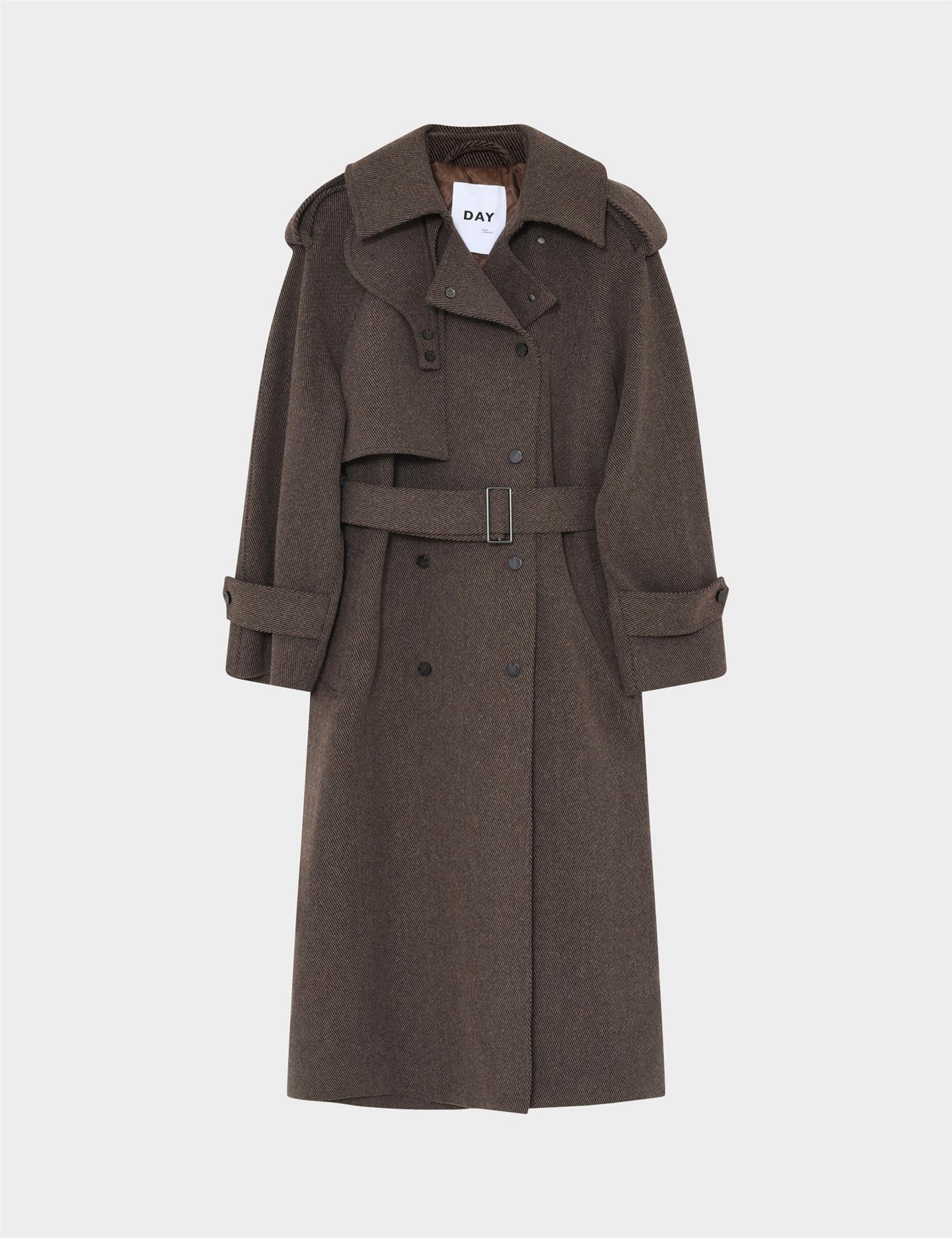 Superfin kåpe fra danske Day Birger et Mikkelsen. Denne tykke, lange kåpen har dobbelspent lukking med trykknapper, et belte i livet og epåletter på skuldrene. Den har sidelommer og en hektelukning i halsen. Kåpen er delvis fôret og har en oversized passform.