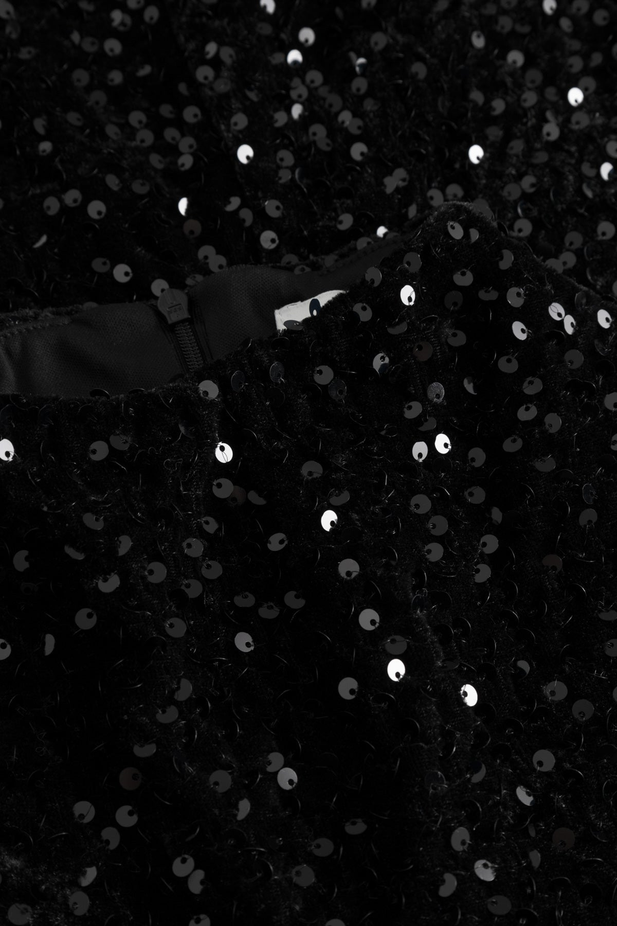 Lekker festkjole fra danske Noella. Kort kjole med høy hals, skulderputer og paljettdetaljer. Den er tettsittende i midjen og lukkes med glidelås bak.